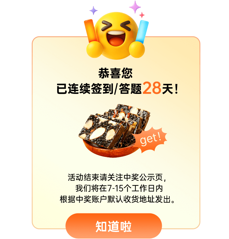 终极打卡奖励: 在28天活动期内,连续打卡满28天且坚持每日健康挑战满28天,即可得到“阿胶固元糕”一份。